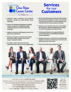 The Greater Raritan Workforce Development Board and its partners working collaboratively under the umbrella of the Greater Raritan One-Stop provide a variety of free programs, services and resources to assist job seekers. This includes assistance with job search, resume reviews, career counseling, career-related webinars and workshops, information on training grants for unemployed and underemployed individuals, and connection to career services for low-income residents. Partners also can link those they are working with to additional free resources available in Hunterdon and Somerset counties and regionally.