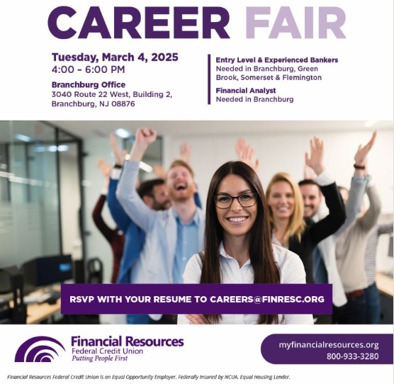 Financial Resources FCU is hosting a Career Fair at its Branchburg office at 3040 Route 22, Building 2, from 4 to 6