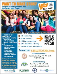 More details are available in this flyer. Hunterdon County businesses may contact Christina Shockley at 908-788-1119 or by email at yes@hcvsd.org. Somerset County businesses may contact Khuti Moses at 908-569-5401 or by email at kmoses@middleearthnj.org.