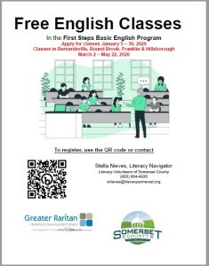 Registration opened on Monday, January 5, 2026, for new classes offered for First Steps Basic English, the free English-language learning program for residents of Somerset County. The program, funded through 2026 by the Somerset County Board of Commissioners with American Rescue Plan dollars, is part of the free adult literacy programs for English-language learners in Hunterdon and Somerset counties offered by partners of the Greater Raritan Workforce Development Board.