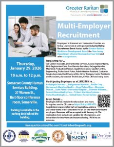 Job seekers are invited to attend an in-person Multi-Employer Inclusive Hiring Recruitment Event presented by the New Jersey Department of Labor and Workforce Development and the Greater Raritan Workforce Development Board on Thursday, January 29, 2026, from 10 a.m. to 12 p.m. The event will be conducted in the first-floor conference room at 27 Warren St., Somerville.