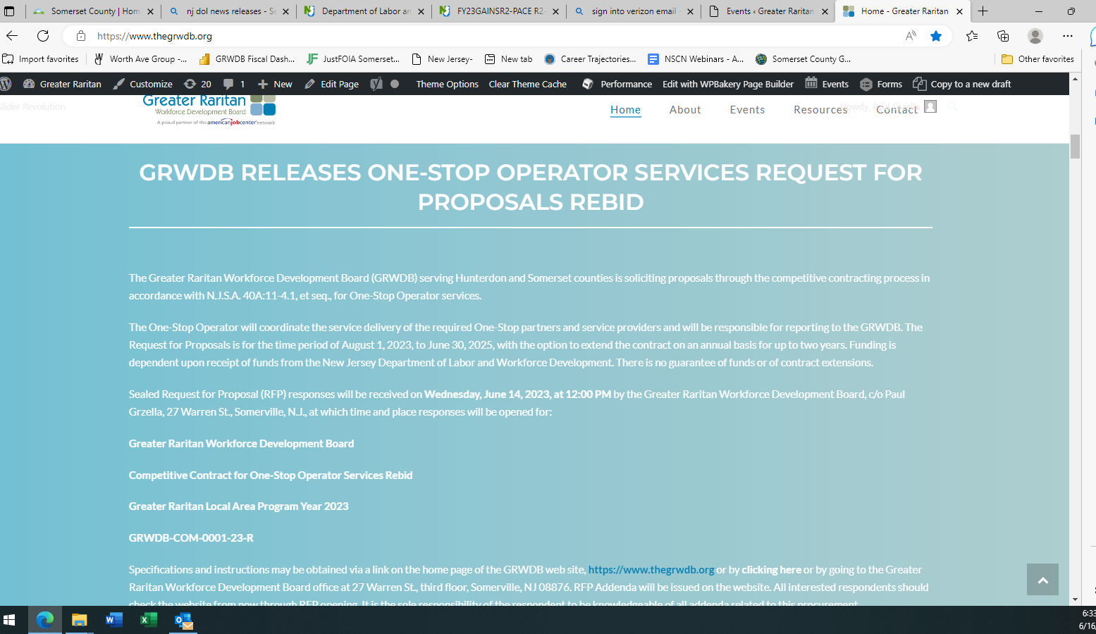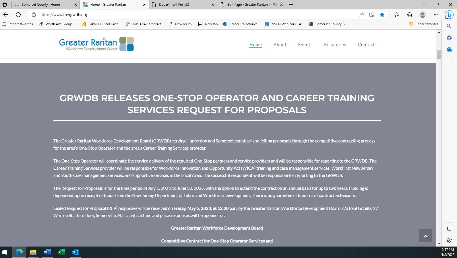 In addition, the GRWDB competitively procures WorkFirst New Jersey services. The current contract for the service began in 2020, for the Program Year running from July 1, 2020, to June 30, 2021, with the option to extend the contract annually for up to four years through June 2025. The Request for Proposals for WorkFirst New Jersey services can be viewed here. In July of 2025, following an additional award of funds from the NJDOL, a contract extension was awarded through September 30, 2025. On Oct. 20, 2025, a Request for Proposals was released for one organization to provide Work First New Jersey To-Work Job Search/Job Readiness and Community Work Experience programming for individuals receiving Temporary Assistance for Needy Families and Supported Work programming for General Assistance and Supplemental Nutritional Aid Program beneficiaries in Hunterdon and Somerset counties. The contract period will be from the award date to September 30, 2026. Go here to review and download the RFP. Responses are due by Thursday November 20, 2025, at 3 p.m. in the Purchasing Division, County Administration Building, 20 Grove St., Somerville, NJ 08876.