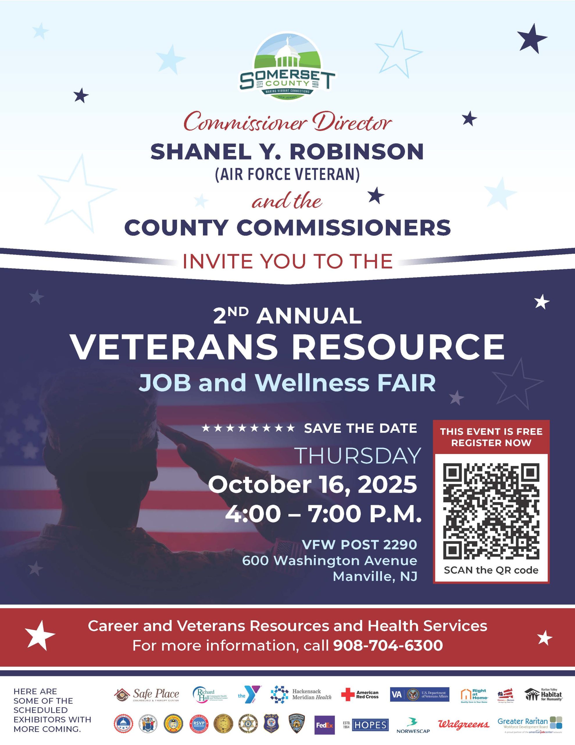 Somerset Commissioner Director Shanel Y. Robinson and the Somerset County Commissioners are presenting the second annual Somerset County Veterans Resource, Job & Wellness Fair from 4 to 7 p.m. Thursday, October 16, at the Thomas J. Kavanaugh Veterans of Foreign Wars (VFW) Post 2290,600 Washington Ave., Manville.