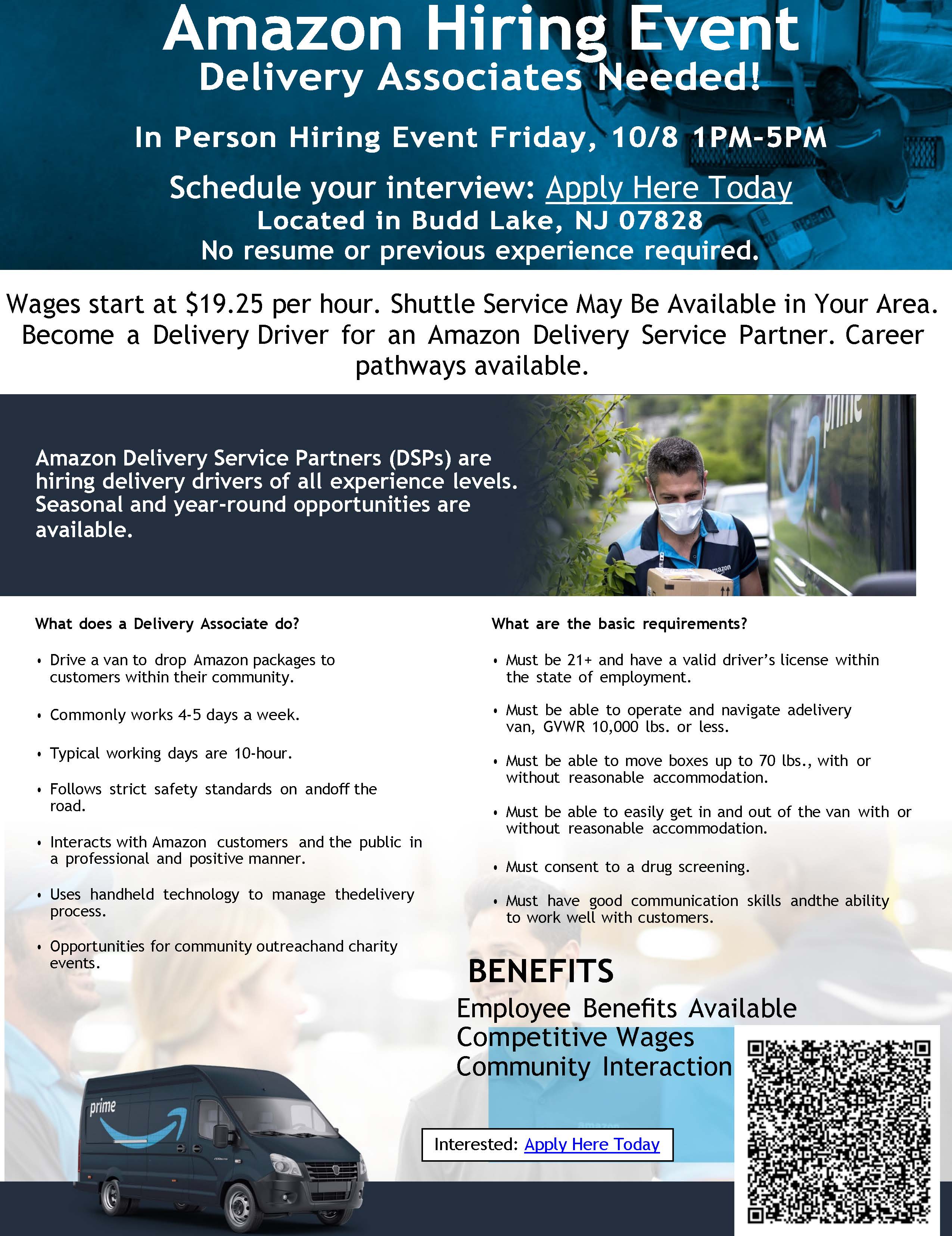 Amazon is hosting an In-Person Delivery Driver Hiring Event from 1 to 5 p.m. Friday, Oct. 8, at its Delivery Station – DNJ7, 81 International Drive South, Budd Lake.