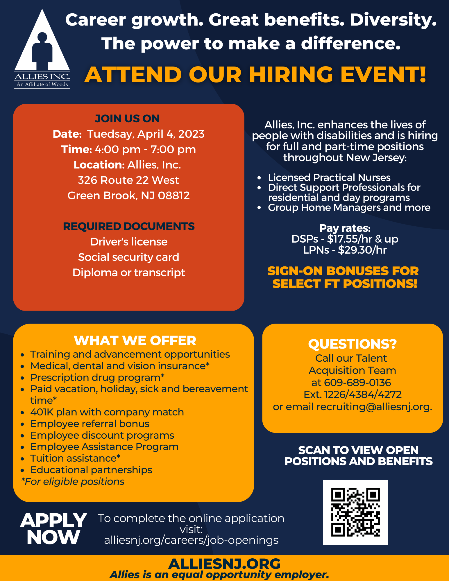 Allies Inc. Day Program is hosting an on-site Hiring Event from 4 to 7 p.m. Tuesday, April 4, at 326 Route 22 W., Green Brook.