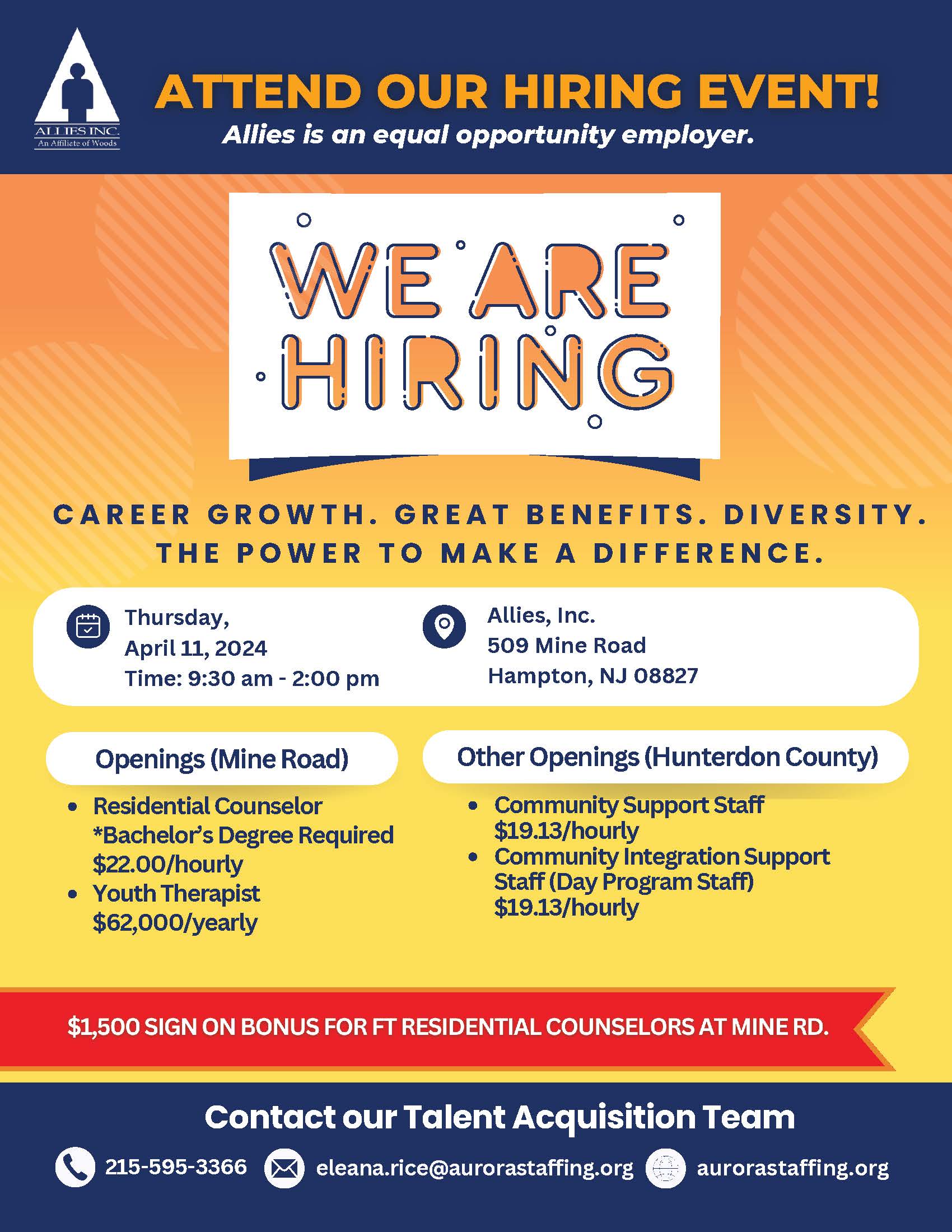 Allies, Inc., a non-profit dedicated to supporting individuals with disabilities, is hosting a Hiring Event on Thursday, April 11, from 9:30 a.m. to 2 p.m., at 509 Mine Road, Hampton. The company is seeking Residential Counselors, a Youth Therapist, Community Support Staff and Community Integration Support Staff at locations in Hunterdon County.
