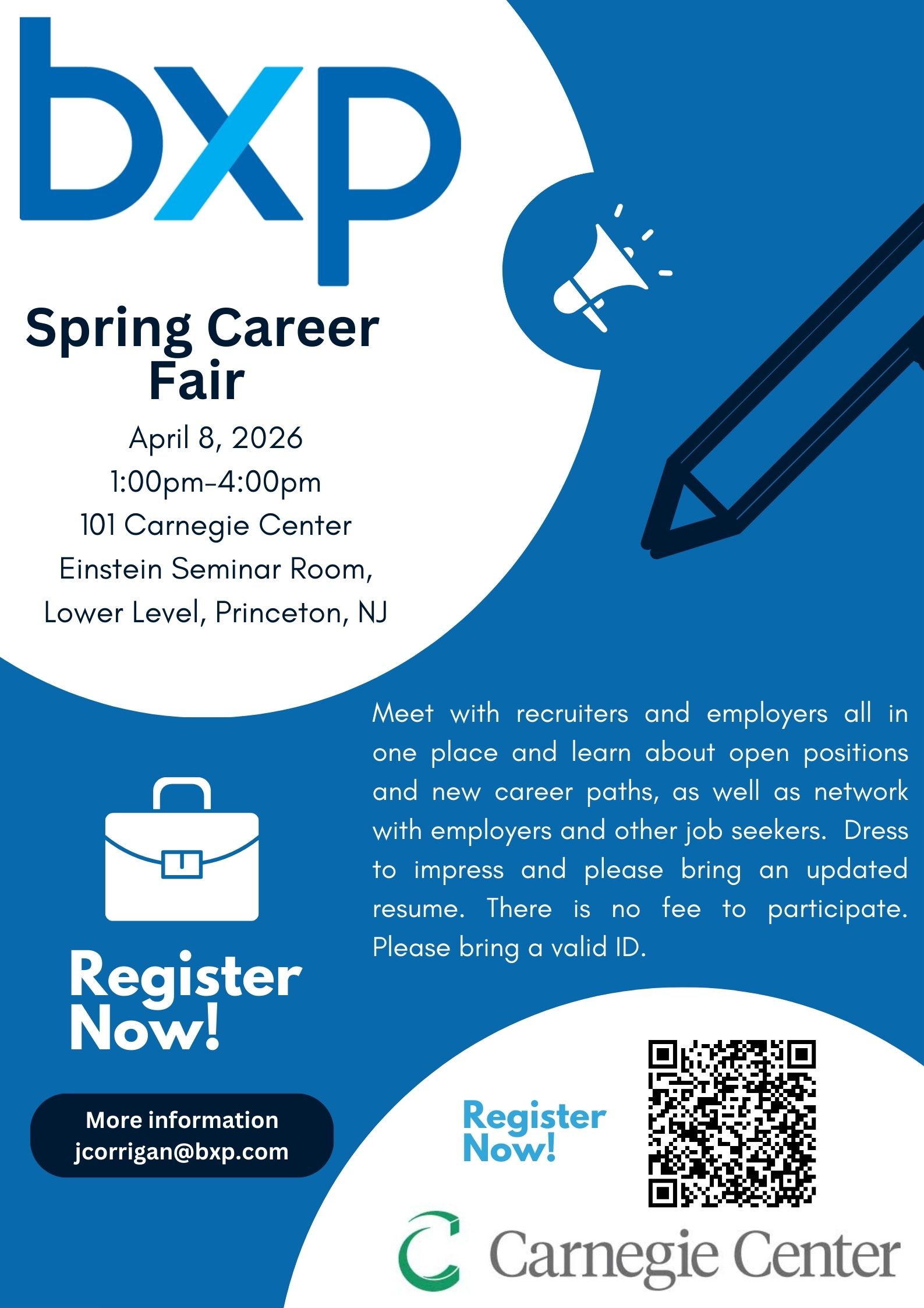 FreeBusinesses in the BXP Carnegie Center Campus are taking part in a Spring Career Fair running from 1 to 4 p.m. Wednesday, April 8, at 101 Carnegie Center, Einstein Seminar Room (Lower Level) Princeton.