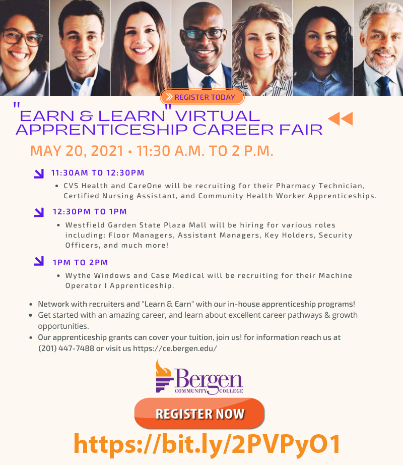 An Earn and Learn Virtual Apprenticeship Career Fair will be conducted on Thursday, May 20, from 11:30 a.m. to 2 p.m. The event, presented by Bergen Community College, starts with apprenticeship information, followed by presentations by employers looking to fill different positions.