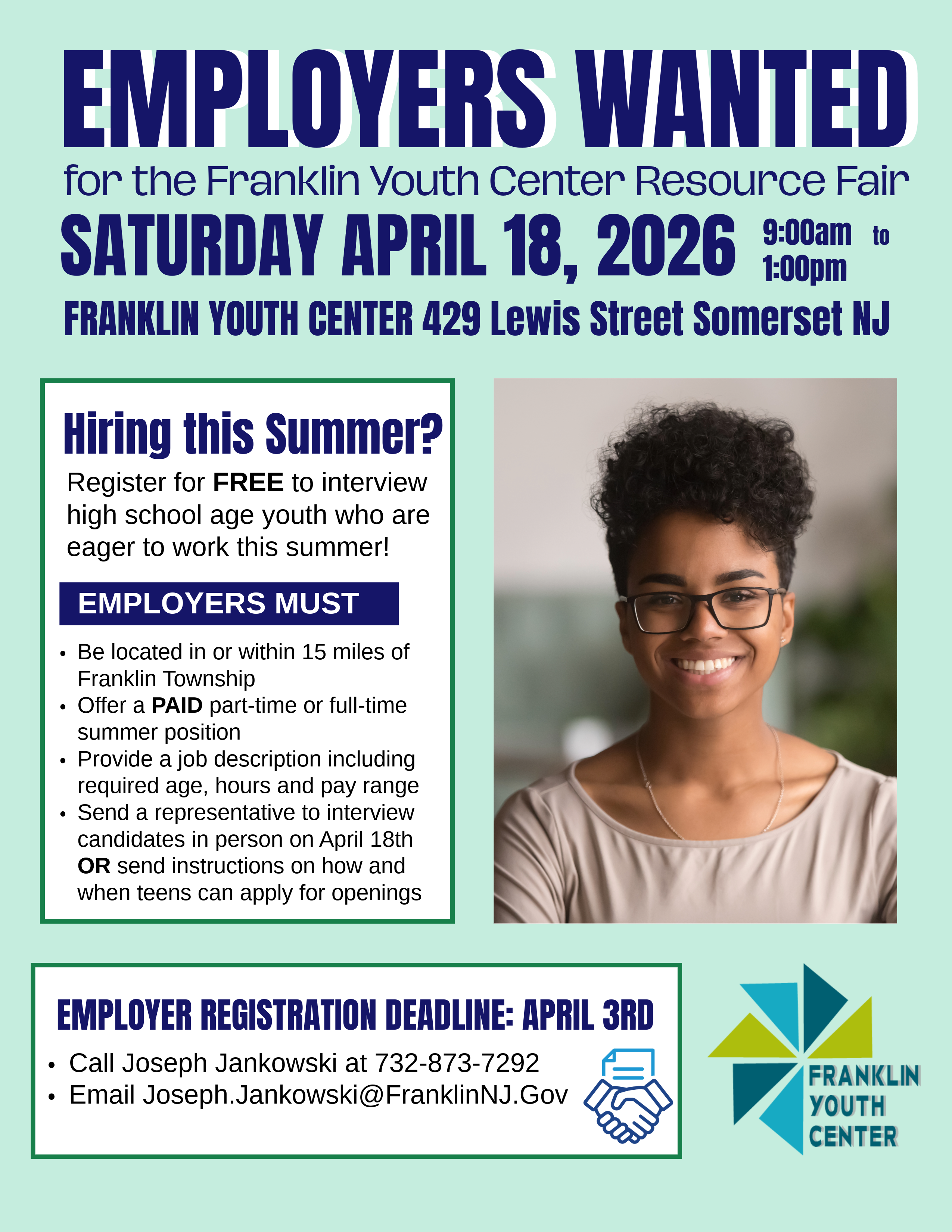 To participate, employers must be located in or within 15 miles of Franklin Township and offer a paid part-time or full-time summer position. Participants also must send a representative to interview candidates in person on April 18 or provide instructions on how and when participants can apply for openings.