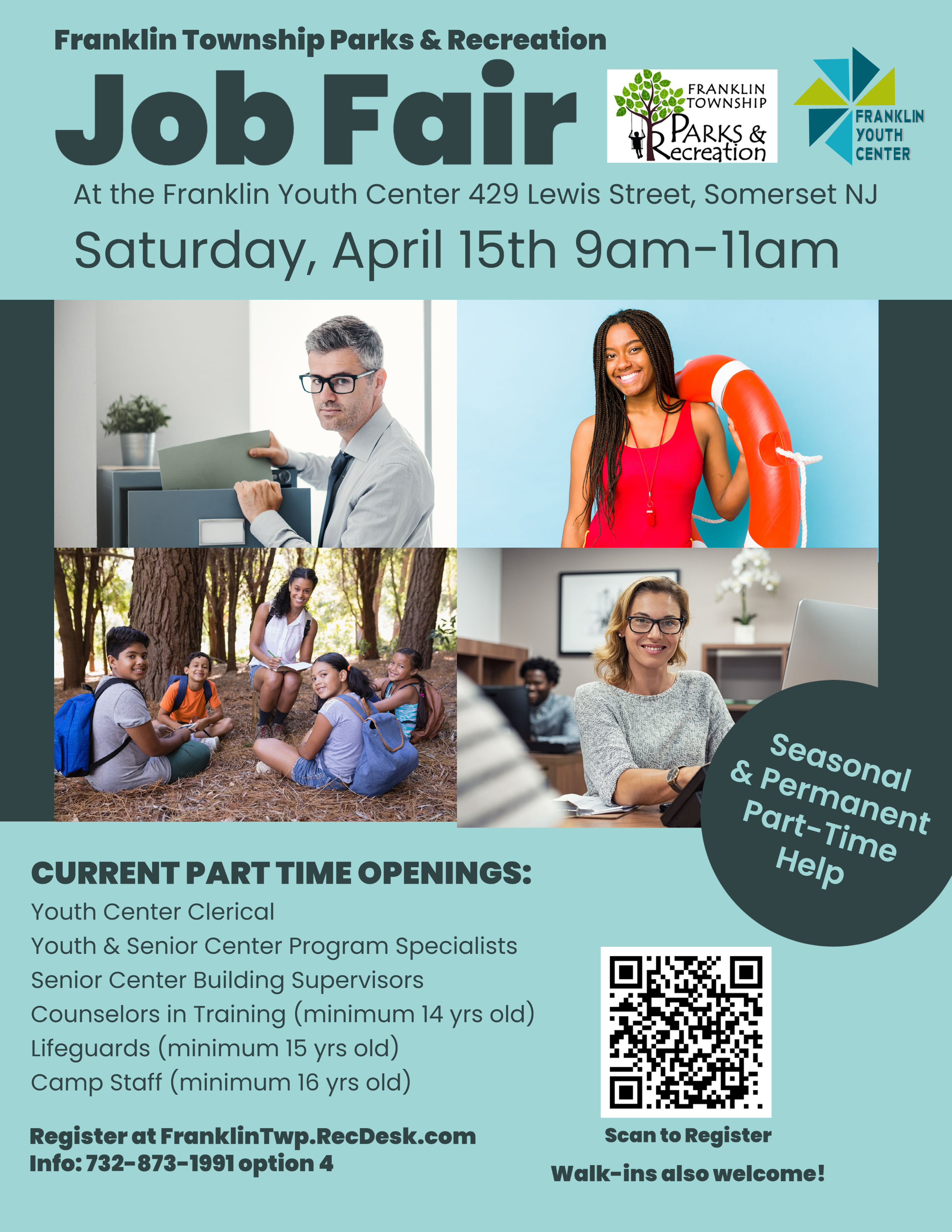 The Franklin Township Parks & Recreation Department is conducting a Job Fair from 9 to 11 a.m. Saturday, April 15, at the Franklin Youth Center, 429 Lewis St., Somerset section of Franklin.