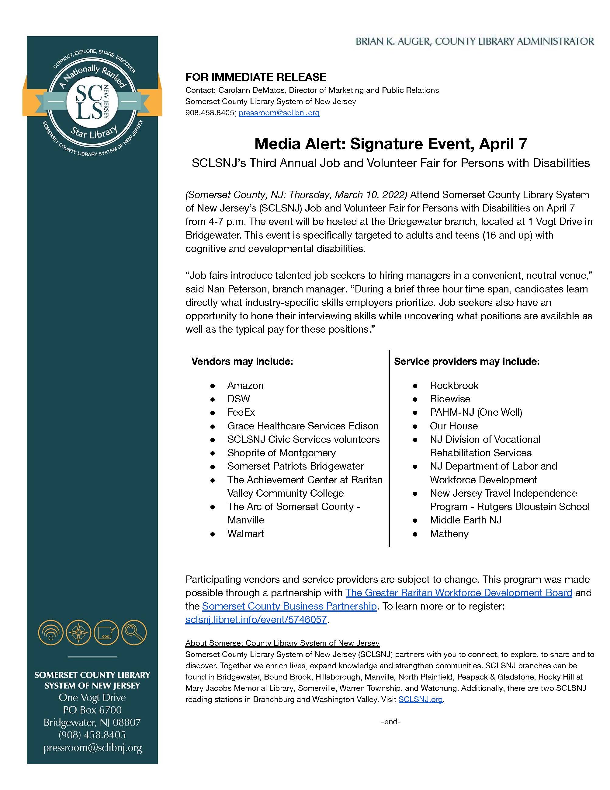 The Somerset County Library System of New Jersey will host a Job and Volunteer Fair for persons with disabilities from 4 to 7 p.m. Thursday, April 7, at the Bridgewater Somerset County Library at 1 Vogt Drive in Bridgewater.
