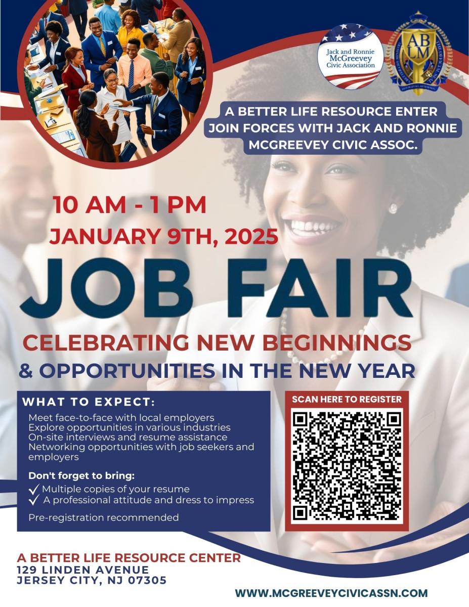 The Job Fair event will be conducted from 10 a.m. to 1 p.m. Thursday, January 9, 2025, at A Better Life Resource Center, 129 Linden Avenue, Jersey City. (Employers are asked to set up beginning at 9 a.m.) Job opportunities will be available in various industries, including Wakefern, Always Health Institute, the New York State Police, Primerica and Express Employment Professionals and many more, and are all invited to attend.