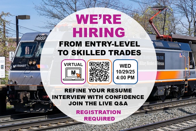 FreeNJ TRANSIT is hosting a Virtual Information Session at 4 p.m. Wednesday, October 29, to learn about current openings, future career paths, and Total Rewards benefits. Speakers will present resume best practices, share interview tips, and host a live Q&A to answer general questions.