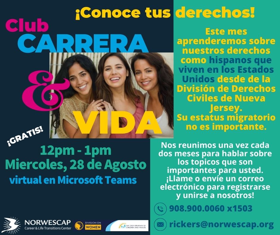FreeNorwescap’s Club de Carrera y Vida en Español presentará Conoce tus Rerechos en Miercoles, 28 de Agosto, 12 – 1 p.m., virtual en Microsoft teams.