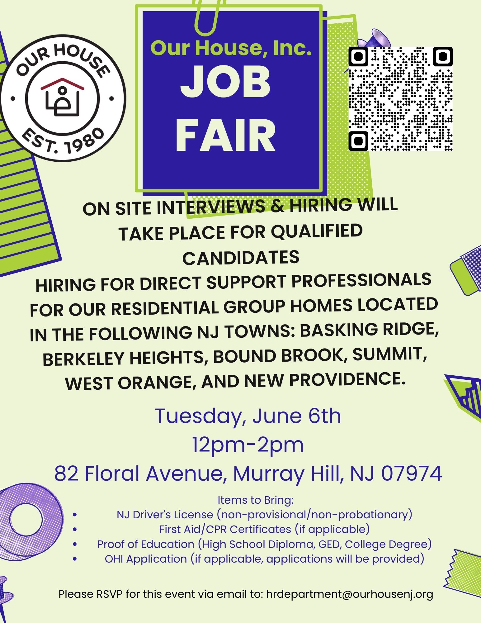 Our House is conducting an in-person Job Fair from 12 to 2 p.m. Tuesday, June 6, at its offices at 82 Floral Ave., Murray Hill.