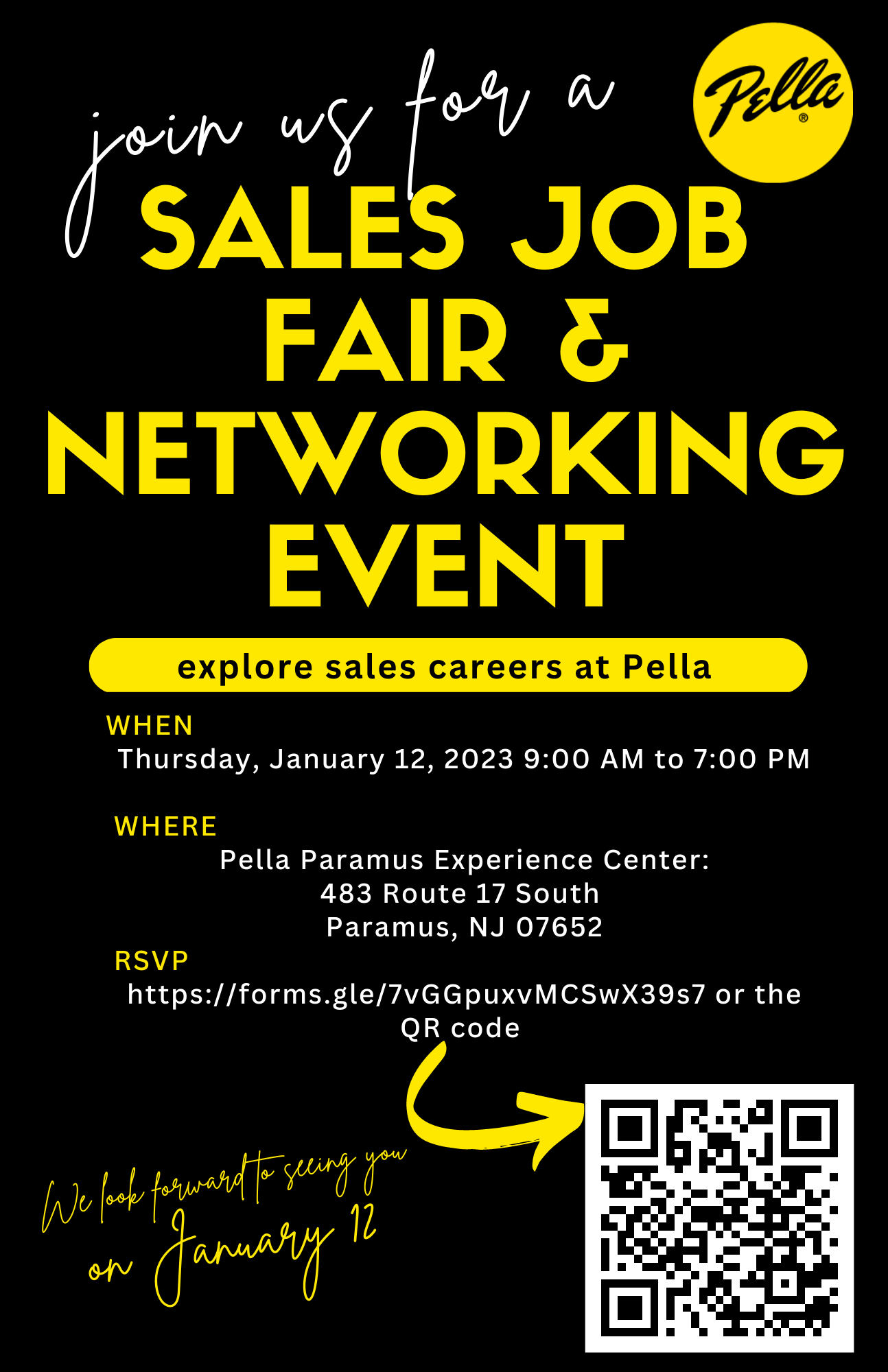 Pella Windows & Doors of New Jersey/New York is hosting a Job Fair and Networking Event on Thursday, January 12, from 9 a.m. to 7 p.m. at the Pella Paramus Experience Center, 483 Route 17 S., Paramus.
