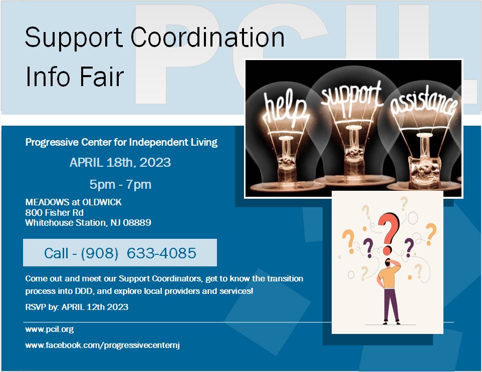 The Progressive Center for Independent Living (PCIL) is hosting a Support Coordination Info Fair from 5 to 7 p.m. Tuesday, April 18, at the Meadows at Oldwick, 800 Fisher Road, Whitehouse Station.