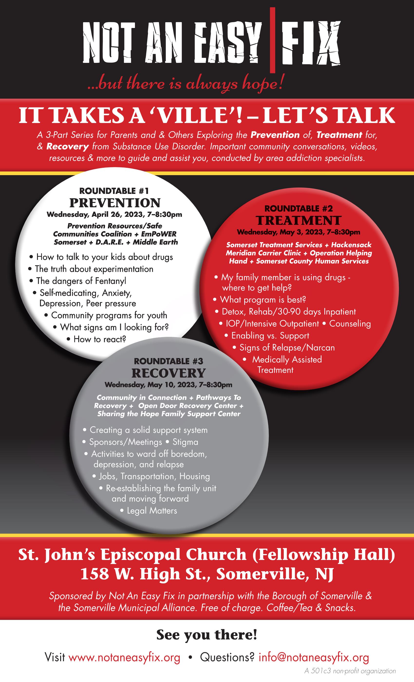 Join a community conversation on Recovery from Substance Use Disorder, which will be conducted from 7 to 8:30 p.m. Wednesday, May 10, at St. John Episcopal Church, Fellowship Hall, 158 W. High St., Somerville.
