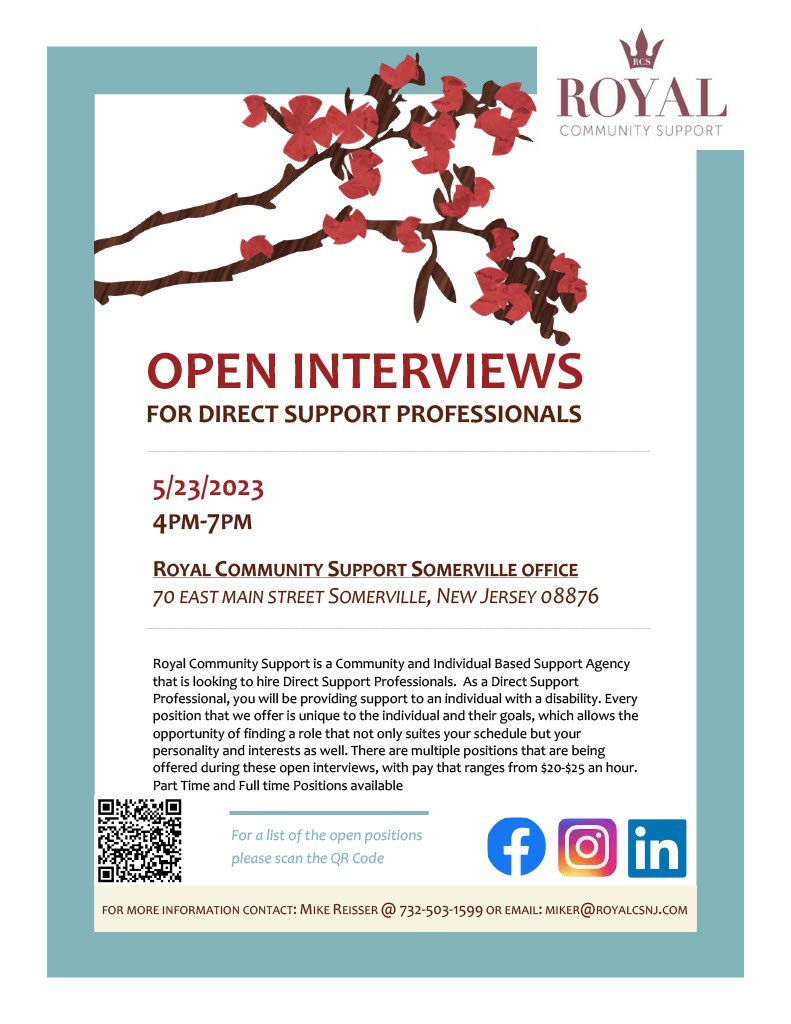 The Somerville-based Royal Community Support is conducting Open Interviews from 4 to 7 p.m. Tuesday, May 23, at Royal Community offices, 70 E. Main St., Somerville.
