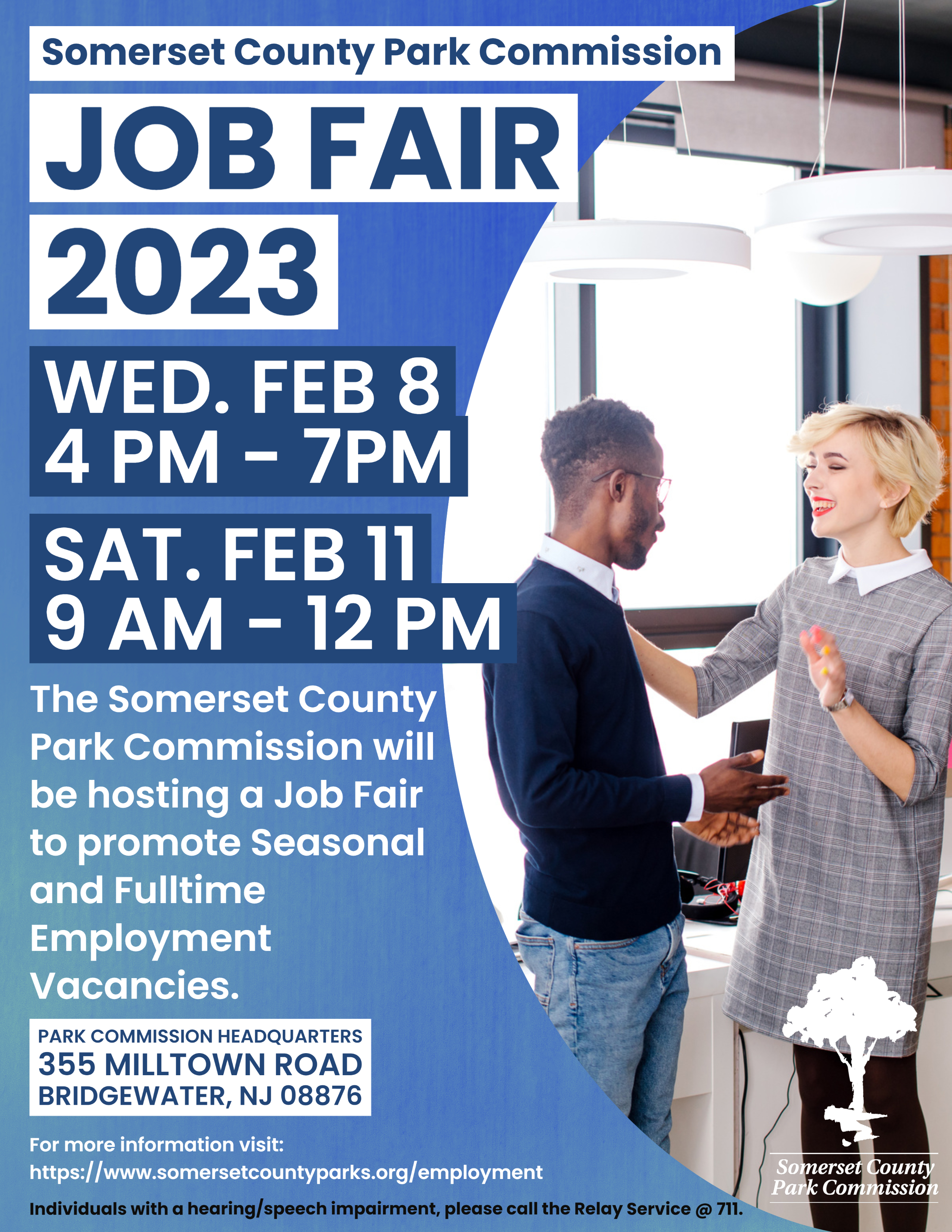 Nature lovers, people who want to change their vocation, or anyone seeking a full- or part-time position should attend the Somerset County Park Commission’s 2023 Job Fairs on Wednesday, Feb. 8, from 4 to 7 p.m., or Saturday, Feb. 11, from 9 a.m. to 12 p.m. The events will occur at 355 Milltown Road, Bridgewater.