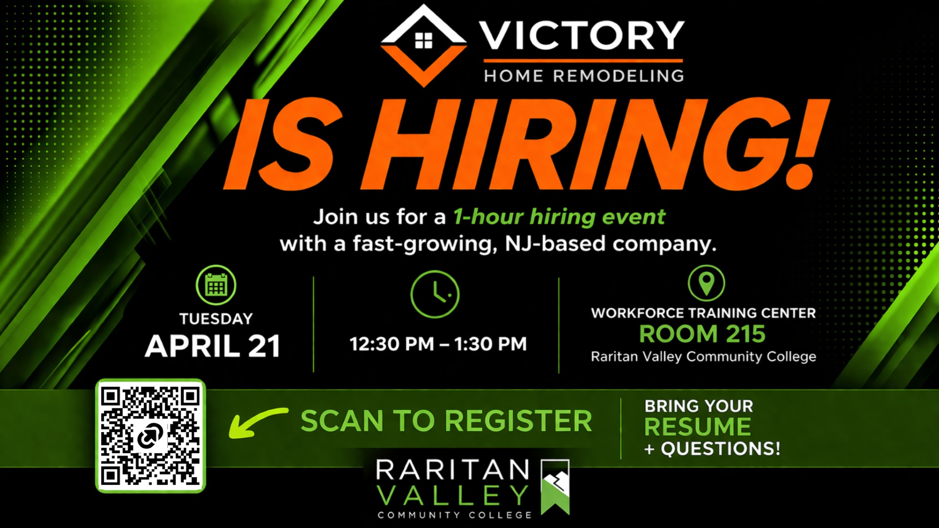 Victory Home Remodeling is hosting a Hiring Event from 12:30 to 1:30 p.m. Tuesday, April 21, in Room 215 of Raritan Valley Community College’s Workforce Training Center, Lamington Road, Branchburg.