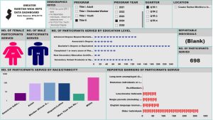 The interactive GRWDB Performance Dashboard provides information on applicants that use the Local Area’s various services. The data used to build this presentation is pulled from a detailed Excel dashboard report compiled monthly by One-Stop Operator Fernandel Almonor using service-level numbers provided by all Greater Raritan Local Area partners. This includes services offered by the GRWDB, vendor partners for career training, youth and WorkFirst New Jersey, and state partners from Employment Services and the Division of Vocational Rehabilitation Services.